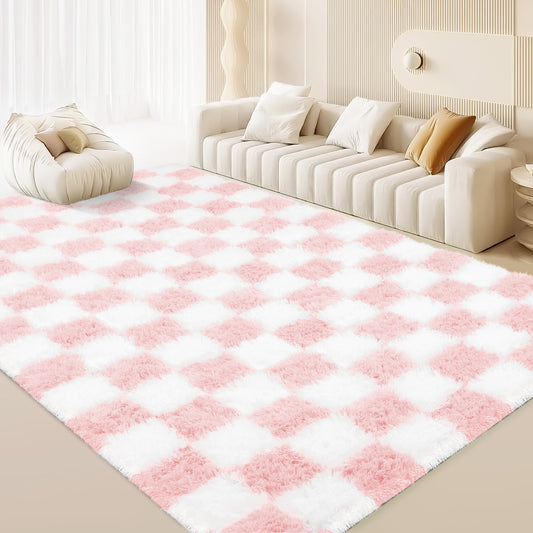 CozyDesg Shag Area Rugs,5'x8'/8' x 10' Soft Fluffy Floor Rugs Checkered Carpet,Washable Area Rugs for Living Room Bedroom Decor,Beige & White