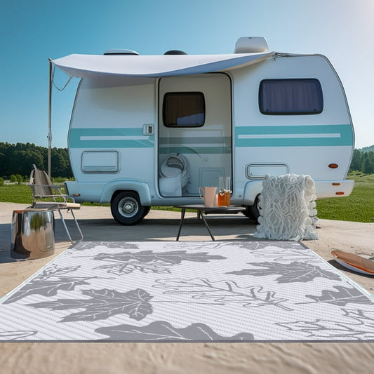 CozyDesg Outdoor Rug Patio Straw Plastic Mat Deck Porch Camper Balcony Area Rug Mat Camping Rugs Waterproof Carpet White & Grey