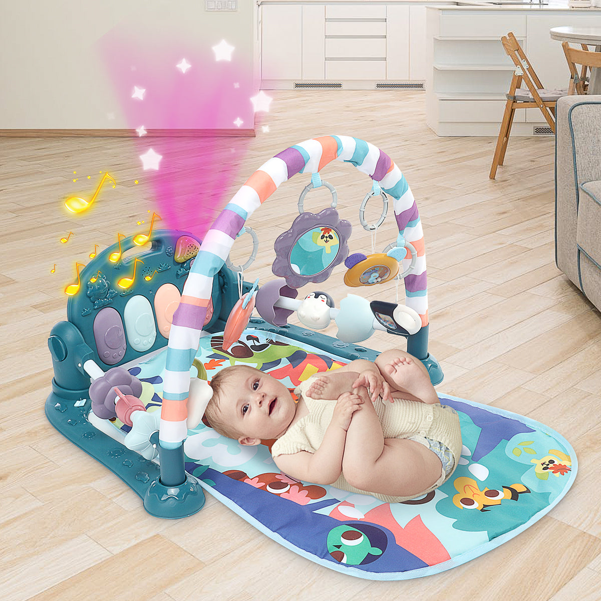 - Play a multifunctional piano fitness frame to accompany the baby.