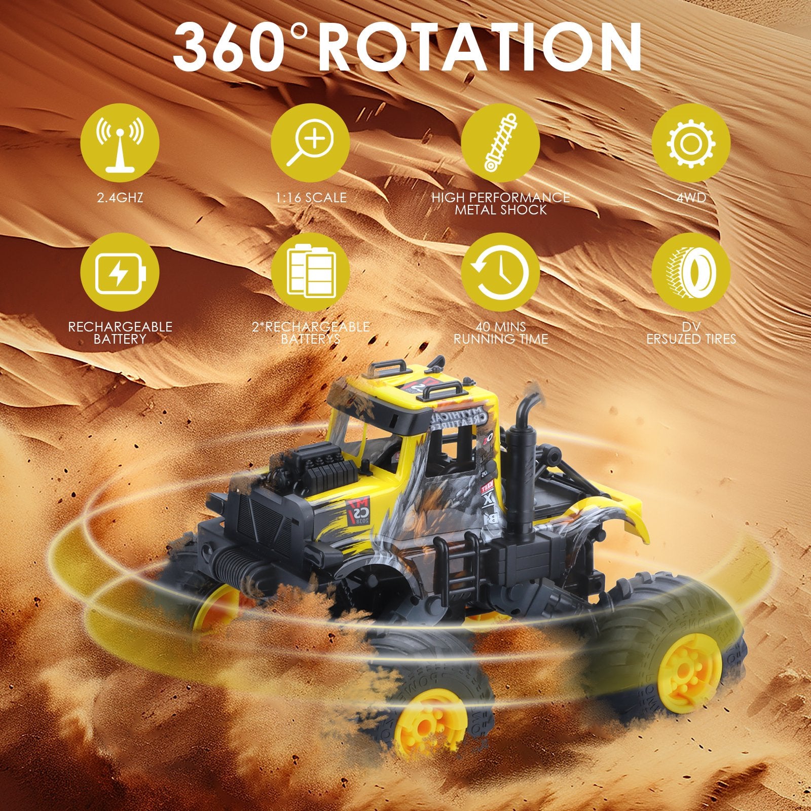 ?1:16 Scale Realistic High Speed RC Cars?: Experience the thrill of high speed racing with our remote control truck. Equipped with a powerful brushed RC motor, it delivers impressive horsepower for maximum speed. Reach top speeds of 20+ Km/h and feel the excitement and enjoyment it brings.?2.4Ghz Non-Jamming Race Car?: Our toy truck features a user-friendly remote controller with 2.4GHz frequency, ensuring non-interference and uninterrupted racing. Enjoy a radio control distance of approximately 260 feet, allowing you to drive this remote control car on various terrains like grassland, sand, and bumpy grounds, without worries.?Oversize Tires?: The RC racing crawler is equipped with durable Thermoplastic Rubber (TPR) tires. These weather resistant tires are designed with high toughness and chemical stability. The anti-slip texture provides strong grip, enabling you to drive this vehicle on all road, and through any rugged terrain such as snow, mud, rocks, and grass. It's all about real toys and real action!?Racing Time Up To 40 Mins?: Enjoy longer and uninterrupted racing with our monster truck. Thanks to the inclusion of 2 high-capacity rechargeable batteries, you can extend your playtime up to 40 minutes, minimizing downtime and maximizing the fun.?Perfect Birthday & Christmas Gifts?: Our monster truck features a cool body shell and high toughness tires, making it an excellent gift choice for birthdays and Christmas. Suitable for kids aged 8-12 years old, as well as adults, it offers an extraordinary gaming experience and endless excitement.