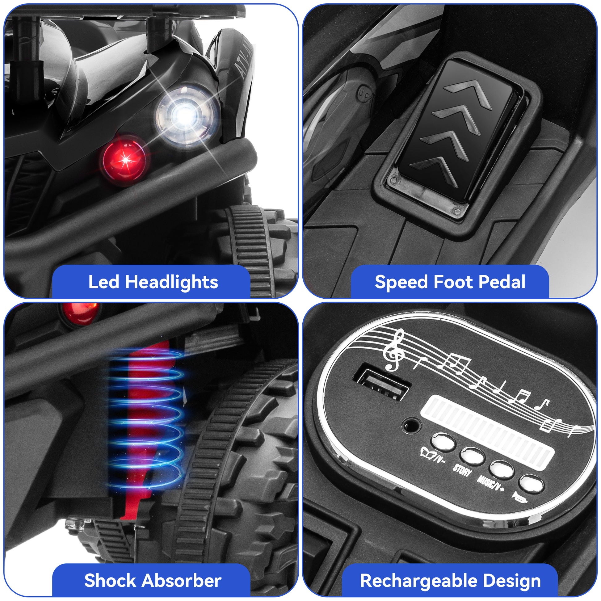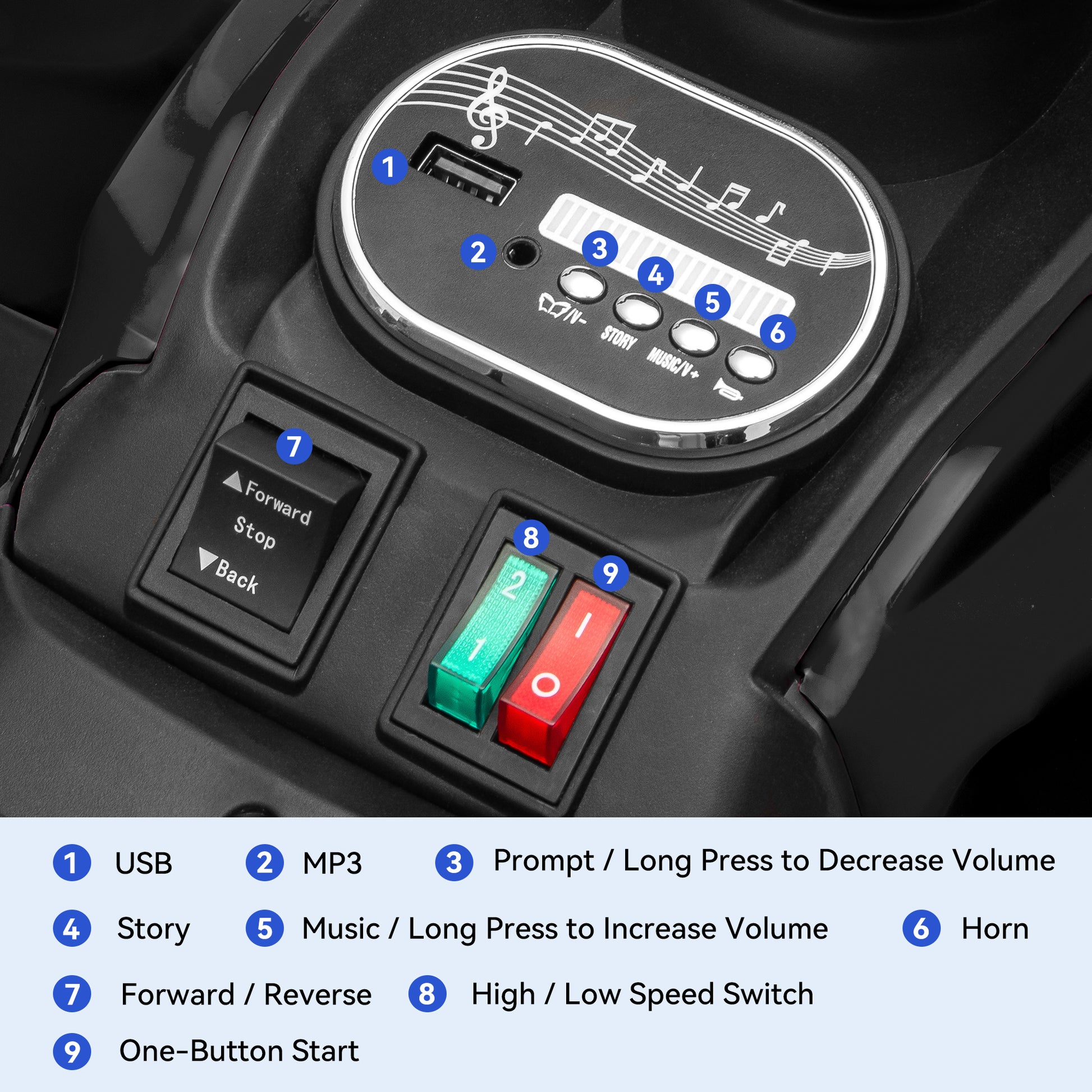 - Built-in headlights and music, with forward/reverse and high/low speed switch.