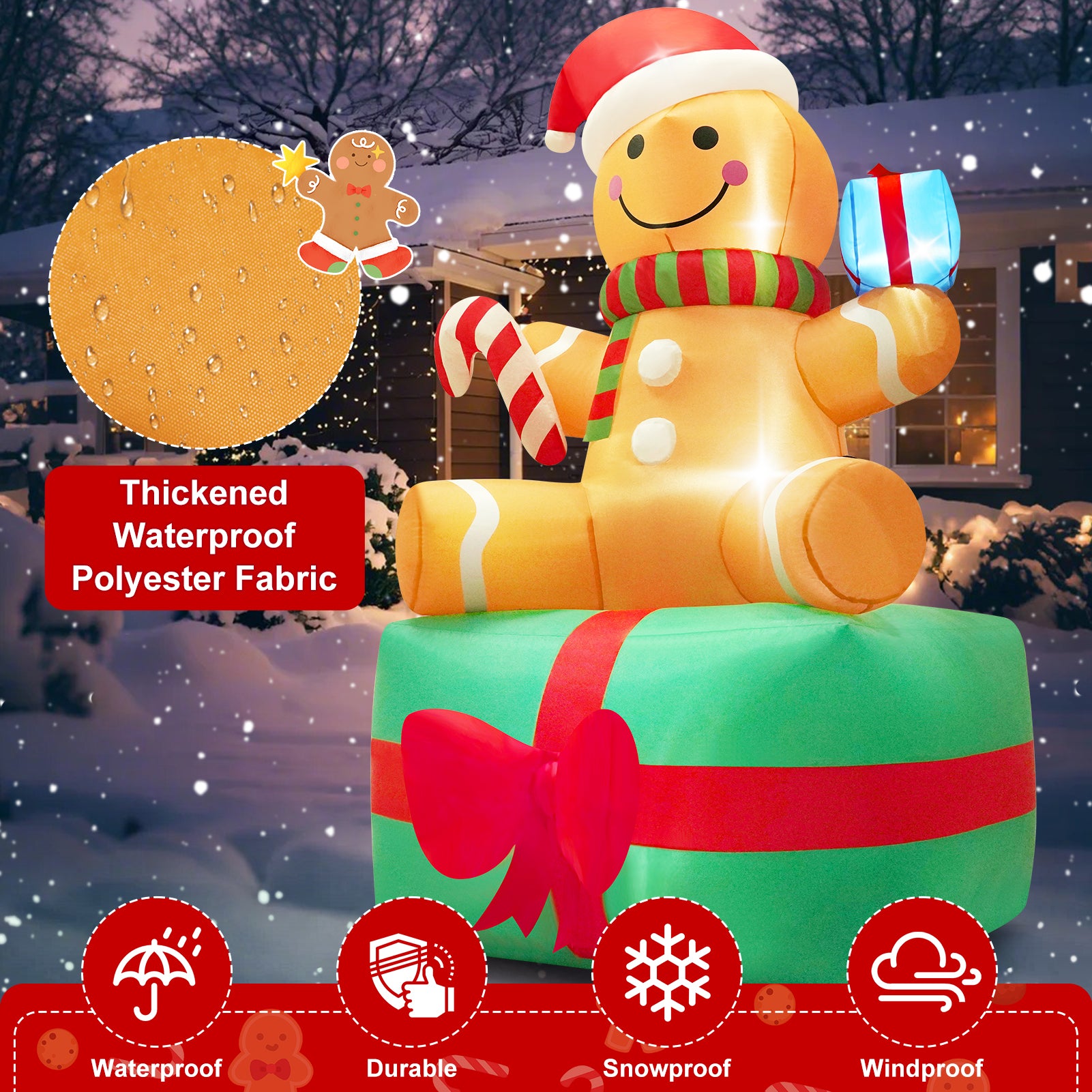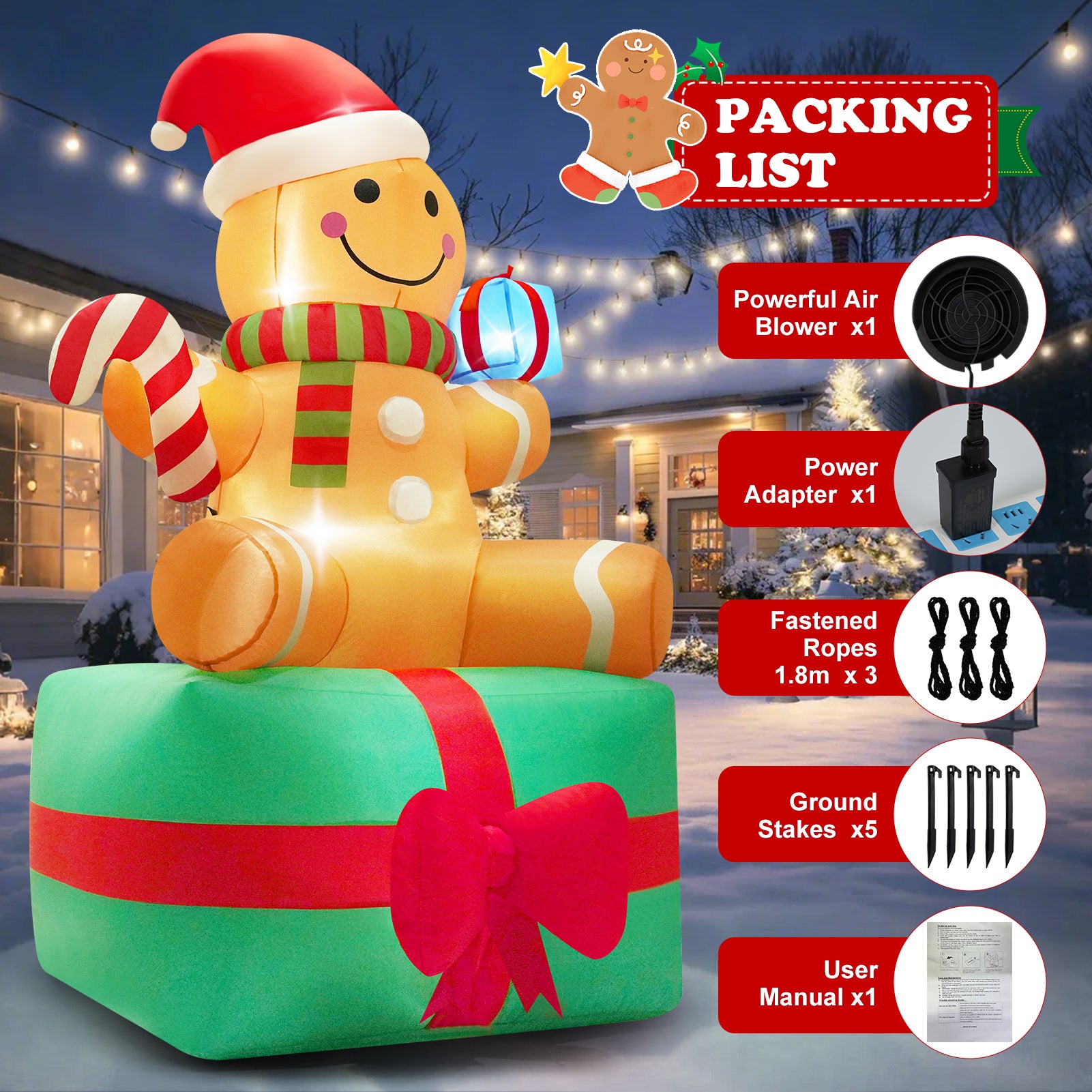 - Bright LED Lights: Comes with 6 sets energy-saving LED lamps, such cute inflatable decor that kids will fall in love with at a glance. This is a great Christmas present. With it, you can enjoy this happy Christmas with your family!The gingerbread makes a fun and cute scene in your garden. Attract Santa Claus to stop here!